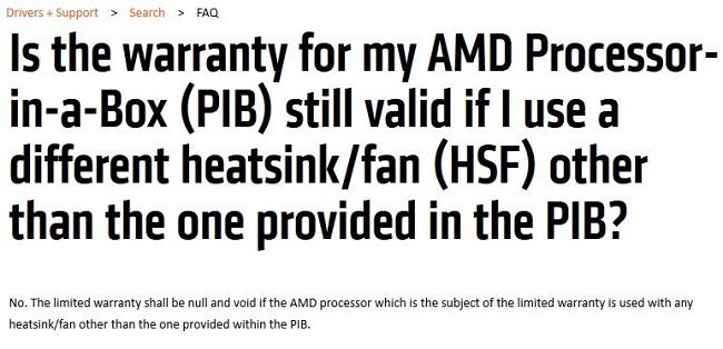 اخیراً بر روی بخش سوالات رایج وب سایت AMD یک پرسش مشاهده شده که پاسخ AMD باعث تعجب همگان شده است. پشتیبان AMD در پاسخ به یک پرسش تاکید کرده استفاده از هر خنک کنندهای جز خنک کننده استوک که همراه پردازنده ارائه میشود، باعث ابطال وارانتی خواهد شد.