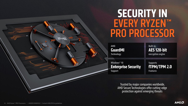 یقیناً امنیت یکی از موضوعات اساسی در دنیای امروز است و AMD سعی کرده با اتخاذ سیاستهای متفاوت از رقیب خود، نظر علاقمندان این حوزه را به خود جلب کند. در حالی که معمولا تعدادی از مدلهای گرانقیمت اینتلی از تکنولوژی vPro این کمپانی بهره میبرند، اما AMD هیچ تفاوتی برای پردازندههای خود درنظر نگرفته و تمامی آنها را به صورت پیشفرض با تمامی ویژگیهای امنیتی خود همراه کرده است. به همین خاطر مشتریان این کمپانی میتوانند بدون پرداخت هیچ هزینهی اضافی امنیت مورد نظر خود را به دست آورند.
