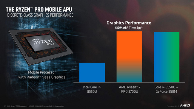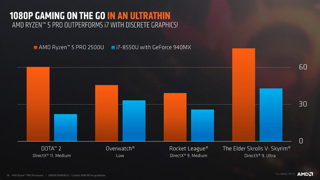 قابلیت گیمینگ مولفهی مهمی در دستگاههای تجاری نیست ولی با این حال در بیشتر موارد شرایطی پیش میآید که یک کارمند از یک سیستم به طور همزمان هم برای انجام کارهای اداری و هم برای بازی کردن استفاده کند. برای همین AMD در این رویداد روی این مسئله تاکید کرد که میتوان به لطف قدرت مناسب پردازندههای Ryzen Pro بهرمند از هستههای گرافیکی Vega، به انجام بازیهای محبوبی همانند DOTA 2، League of Legends و یا Rocket League آن هم در وضوح تصویر p۱۰۸۰ پرداخت. بر اساس مقایسههایی که در تصاویر زیر نشان داده شدهاند، محصولات جدید AMD، نه تنها توانستهاند پردازندههای Core i7-8550U اینتل را شکست دهند، بلکه در مقایسه با سیستمهایی با پردازندههای گرافیکی اختصاصی Nvidia GeForce 950M و Nvidia GeForce 940MX هم عملکرد بهتری را از خود نشان میدهند.