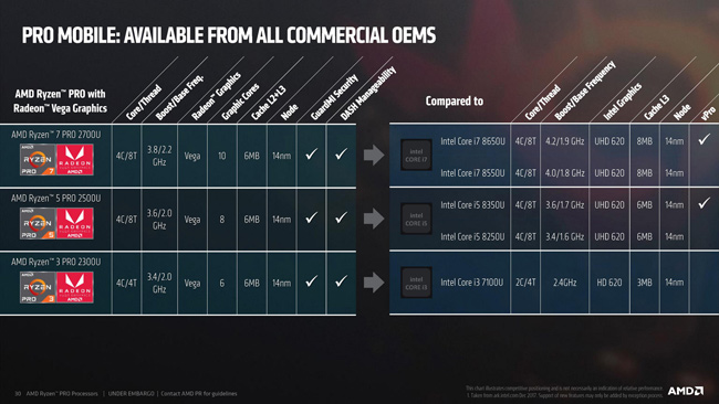 AMD در این رویداد از چند مدل از APU های خود برای پلتفرمهای همراه و رایانههای شخصی رونمایی کرد که تمامی آنها از یک پردازندهی مبتنی بر معماری Ryzen و هستههای گرافیکی Radeon Vega تشکیل شدهاند. ساختار تمامی این محصولات یکسان بوده و صرفاً اختلاف آنها در کلاک پردازنده، تعداد هستههای گرافیکی و میزان TDP است. هر سه مدل مخصوص پلتفرمهای همراه از ۴ هستهی پردازشی بهره میبرند که در دو نمونهی سریعتر Ryzen 5 Pro 2500U و Ryzen 7 Pro 2700U، قابلیت اجرای هشت ترد به صورت همزمان وجود دارد. در نقطه مقابل نمونهی کوچکتر Ryzen 3 Pro 2300U صرفاً توانایی اجرای ۴ ترد همزمان را دارد. میزان گرمای تولیدی این سه مدل در بازهی ۱۲ الی ۲۵ واتی قرار داشته و از این لحاظ شبیه پردازندهی فعلی Kaby Lake-R اینتل هستند. دو نمونه دسکتاپ Ryzen Pro 2400G و Ryzen Pro 2200G(هر دو ۶۵ واتی) هماکنون در نمونههای ۳۵ واتی با نامهای 2400GE و 2200GE در دسترس قرار دارند و مناسب برای تولید رایانههای کوچک و جمع و جور هستند.