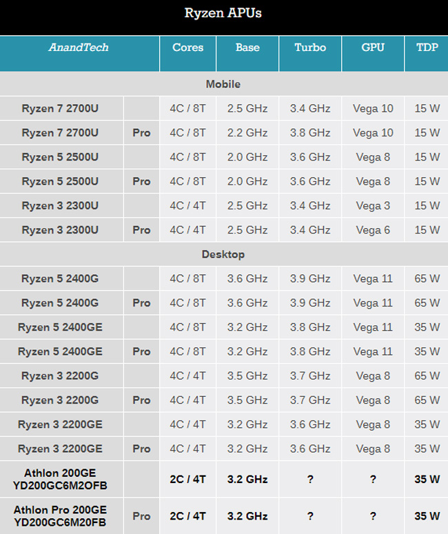 با بررسی اطلاعات دو منبع میتوانیم به یکسان بودن پردازندههای اشاره شده پی ببریم که صرفاً تنها تفاوت آنها در پسوند Pro یکی از منابع اطلاعاتی است که معمولاً AMD از آن برای برند تجاری خود برای مشتریانش استفاده میکند. به هر حال ما با یک پردازندهی دو هستهای با فرکانس پایه 3.2HGz و میزان TDP ۳۵ واتی مواجه هستیم که از ۲ یا ۴ مگابایت کش برخوردار است. هر دو منبع دو مقدار متفاوت را اعلام کردهاند ولی معمولا اطلاعات ایسوس(۴ مگابایت کش) دقیقتر است. هیچ کدام از منابع صحبتی در مورد وجود ویژگی turbo و یا گرافیک داخلی در این پردازندهها نکردهاند ولی با این حال Geekbench این محصولات را با نام تجاری Raven Ridge فهرست کرده است که این میتواند نشان از طراحی CPU+GPU در آنان باشد که به دنبال آن میتوانیم به فناوری ساخت ۱۴ نانومتری آنها هم پی ببریم.