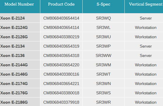 بر اساس مستندات منتشر شده از سوی اینتل، سری Xeon E-2000 در برگیرنده دست کم 10 مدل پردازنده جدید است که هفت مدل آنها (با پسوند G) دارای پردازنده گرافیکی مجتمع هستند.