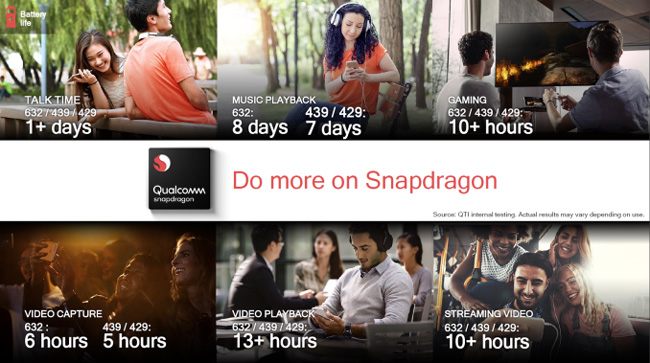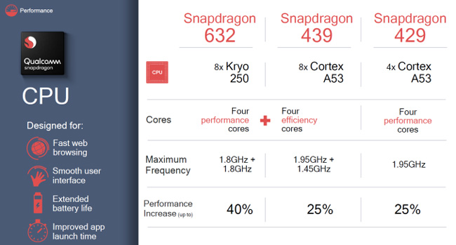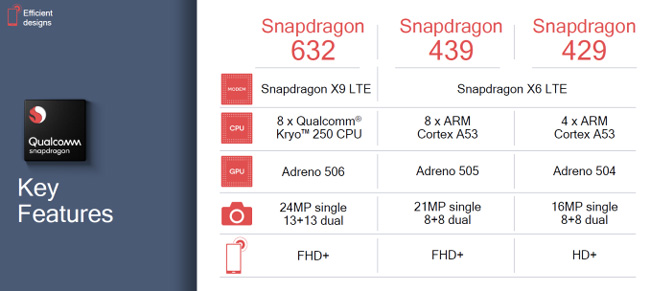 | SoC | Snapdragon 632 | Snapdragon 439 | Snapdragon 429 | |