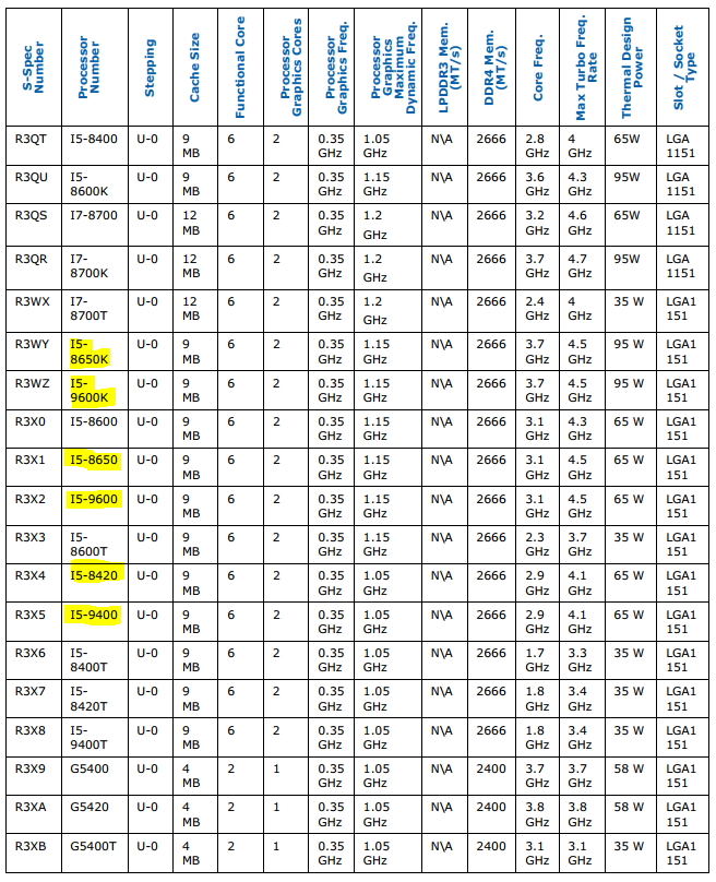 طبق سند رسمی منتشر شده، پردازندههای Core i5 سری 9000 اینتل شش هستهای هستند و خبری از مدلهای هشت هستهای نیست، همچنین همانند مدلهای فعلی، فناوری Hyper-threading در این سری یافت نمیشود. اما بارزترین تغییر پردازندههای سری 9000 اینتل، افزایش 100 تا 200 مگاهرتزی بیشینه فرکانس توربو بوست است. در این لیست مدل های جدید از سری 8000 نیز یافت می شوند که در اصل به عنوان Coffee Lake Refresh شناخته می شوند.