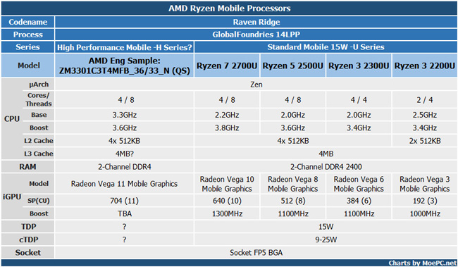 این CPU-ها ۴ هستهای بوده و از قابلیت SMT یا همان تردهای دوگانه به ازای هستهها هم برخوردار هستند. این نمونه در کلاک پایه 3.3GHz و همچنین کلاک بوست 3.6GHZ فعالیت میکند. در زمینهی واحد پردازش گرافیکی هم محصول ZM3301C3T4MFB_36/33_N که البته بعضی آن را نمونهی Ryzen 5 2400H مینامند از مشخصاتی بهره میبرد که به مشخصات نمونهی AMD 2400G شباهت زیادی دارد که البته یکی از تفاوتهای میان آنها را میتوان در مصرف انرژي پایینتر نمونهی جدید دانست.