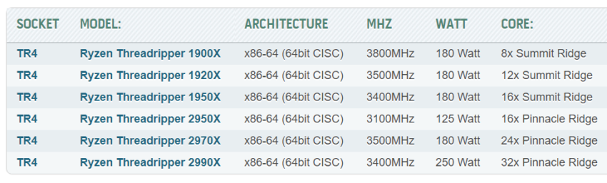 رده بالاترین پردازنده این سری Threadripper 2990X با 32 هسته پردزاشی و توان طراحی گرمایی 250 وات است که به وضوح کم نیست، بنابراین دفع گرما و همچنین تأمین توان مورد نیاز آن چندان آسان به نظر نمی رسد. Threadripper 2970X دارای توان طراحی گرمایی 180 وات و 24 هسته پردازشی است.