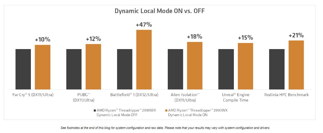 AMD ماه میلادی جاری یک آپدیت جدید منتشر خواهد کرد که با معرفی یک حالت کارایی جدید به نام Dynamic Local Mode همراه است. قابلیت مزبور برای پردازندههای سری Ryzen Threadripper WX طراحی شده و بهبود کارایی از طریق بهینه سازی دسترسی به حافظه رم را دنبال میکند. این قابلیت به طور هوشمند Thread های را با هستههای پردازشی اجرا میکند که دارای حافظه محلی هستند، به عبارتی دیگر؛ Thread ها توسط هستههای پردازشی قرار گرفته بر روی قطعه سیلیکونی متصل به کنترلر حافظه اجرا میشوند. در صورتی که Thread به تعداد بیشتری هسته پردازشی نیاز داشته باشد، از تمامی هستهها استفاده میشود. آنچه که گفته شد به طور هوشمند در اجرای Thread هایی که به حافظه سریع نیاز دارند اعمال می شود.