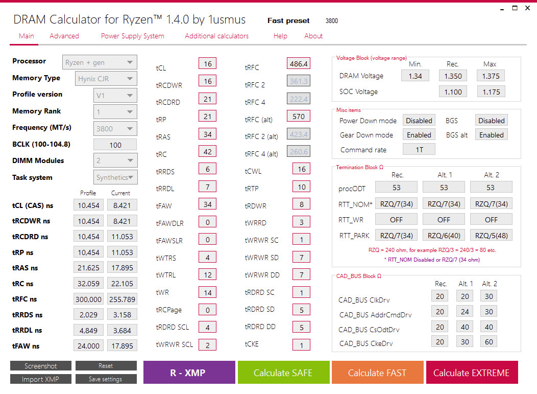 اغلب کاربران غیر حرفهای هنگام اورکلاک کردن ماژولهای حافظه به افزایش فرکانس و نهایتاً 4 یا 5 تایمینگ اصلی بسنده میکنند، در این حالت مادربرد خود سایر مقادیر را تنظیم میکند که غالباً چندان ایده آل نیستند و صرفاً با هدف رسیدن به پایداری انتخاب میشوند. به کمک برنامه DRAM Calculator for Ryzen میتوان مقدار بهینه تمامی پارامترهای مرتبط با حافظه رم را به دست آورد. کافی است برنامه را اجرا کرده و از میان یکی از سه حالت Fast، Safe یا Extreme، یکی را انتخاب کنید تا تنظیمات بهینه محاسبه شوند.
