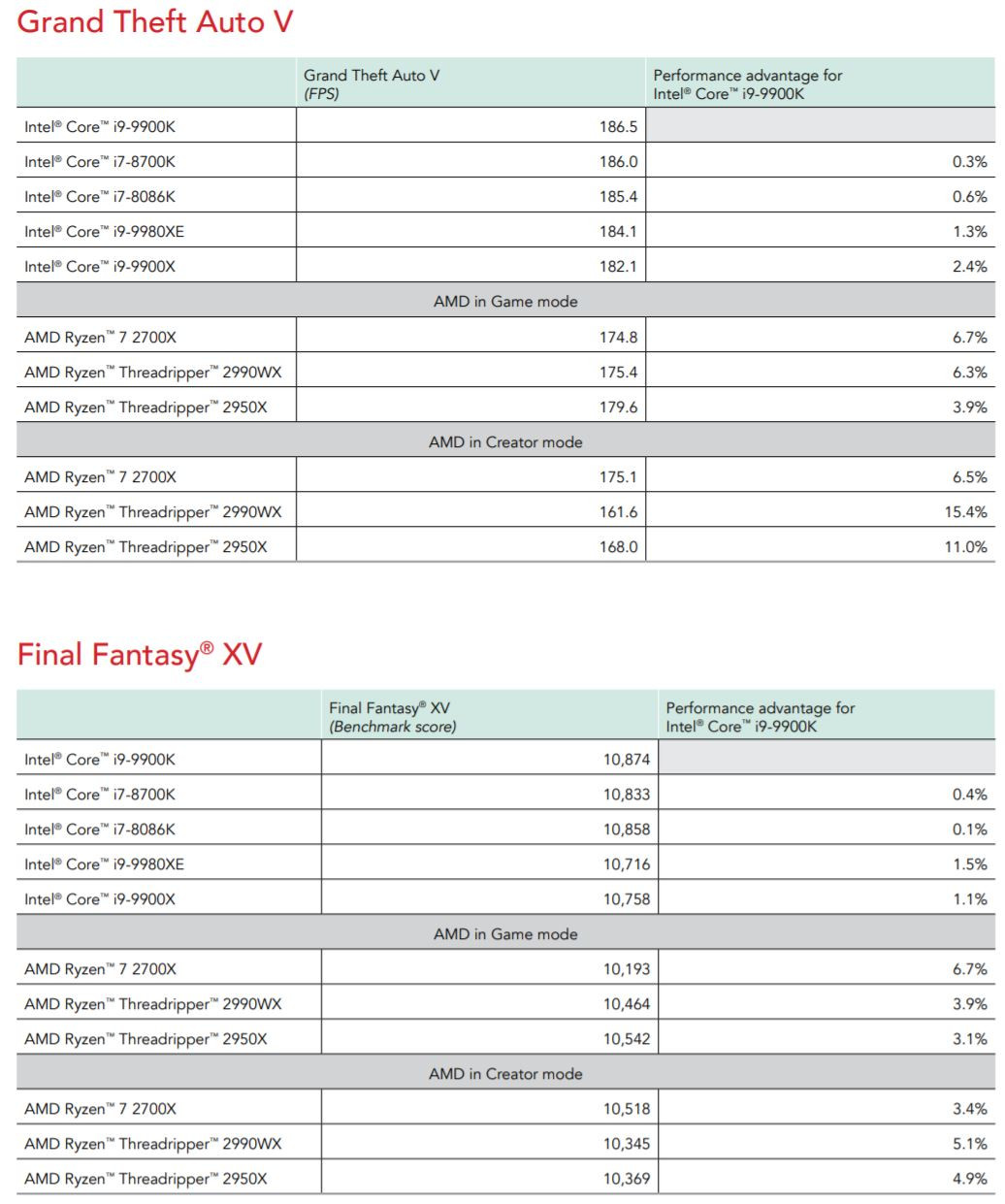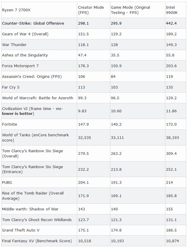 نتایج پیشین حاکی از تا 50 درصد عملکرد سریعتر i9-9900K نسبت به 2700X در اجرای بازیها بود. در تستهای جدید حالت Creator Mode پردازنده 2700X فعال شده تا هر 8 هسته پردازشی آن در دسترس بازیها باشد، با این حال Principled Technologies تنظیمات حافظه را اصلاح نکرده و هنوز میتوان به جرات گفت تنظیمات اعمال شده به ضرر AMD تمام میشود. در هر صورت با همین شرایط غیر عادلانه هم حالا نتایج نشان میدهد برتری i9-9900K نسبت به 2700X تک رقمی است و دیگر خبری از برتری 50 درصدی نیست!