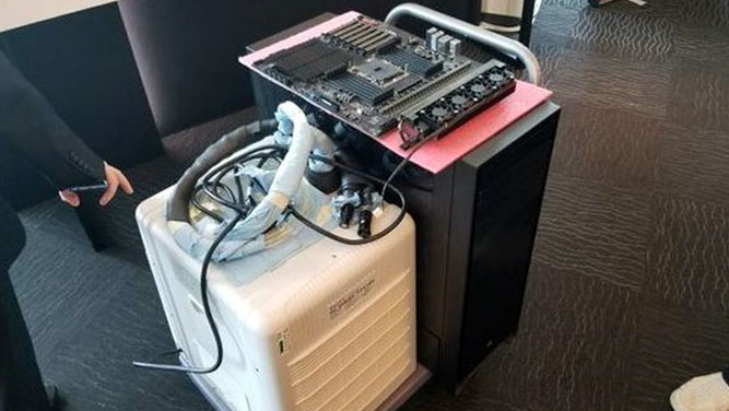 ممکن است به یاد داشته باشید اینتل در نمایشگاه کامپیوتکس گذشته یک پردازنده مرموز را در اجرای بنچمارک Cinebench به نمایش گذاشته بود که تحسین همگان را برانگیخت، با این حال آن زمان اینتل هیچ اشارهای به پلتفرم و مدل این پردازنده نکرد. در آن زمان پردازنده 28 هستهای اینتل توانسته بود امتیاز 7334cb را در بنچمارک Cinebench ثبت کند که بالاترین امتیاز به ثبت رسیده با تنها یک پردازنده بود. اما همان زمان بهکارگیری یک آب سرد کن 1770 واتی برای خنگ نگه داشتن پردازنده 28 هستهای اینتل جنجالی شد که البته بعدتر فهمیدیم برای اورکلاک این پردازنده به 5 گیگاهرتز مورد استفاده قرار گرفته و رکورد Cinebench در حالت اورکلاک شده به ثبت رسیده بود. جالب اینکه در نمایشگاه مورد بحث اینتل آب سرد کن را با فاصله از سیستم دمو نصب کرده بود تا بازدیدکنندگان متوجه وجود آن نشوند.