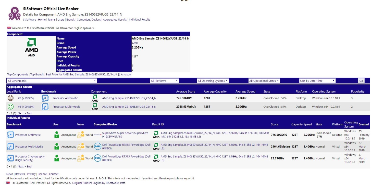 همانطور که گفتیم این نسخه از بستر تست که متعلق به شرکت DELL است، Dell PowerEdge R7515 نام داشته و ساختار سروری دو سوکته دارد. همچنین در این اطلاعات جدید مشخص شده است که این چیپ دارای حافظه کش سطح دو 512 کیلو بایتی (64 واحد) و حافظه سطح سه 256 مگابایت دارد. این تست همچنان نشان میدهد که فرکانس کلاک متوسط این پردازنده در طول تست 2.2 گیگاهرتز بوده است.