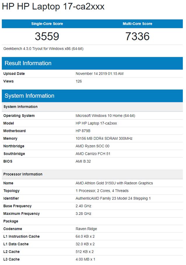 در پایگاه داده Geekbench به تازگی نام یک پردازنده جدید از AMD به همراه برخی از مشخصات فنی آن به ثبت رسیده است. پردازنده ای با نام Athlon Gold که یک پردازنده فوق کم مصرف از سری U است. این پردازنده با نام کامل AMD Athlon Gold 3150U در یک لپ تاپ HP نصب شده و به نظر می رسد که به زودی روانه بازارهای جهانی شود. این پردازنده دارای فرکانس پایه 2.4 گیگاهرتز بوده و در فرکانس بوست به رقم حداکثر 3.28 گیگاهرتز دست پیدا خواهد کرد.