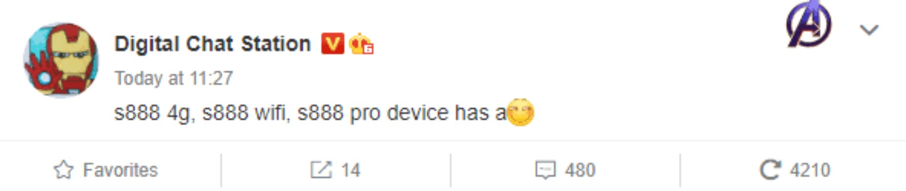 امروز هم Digital Chat Station افشاگر معروف با اتشار پستی در شبکه اجتماعی Weibo با اشاره به سه عضو جدید خانواده اسنپدراگون 888 اعلام کرده کوالکام تا پایان سال جاری میلادی نسخه پرو، نسخه 4G و نسخه وایفای این پردازنده را تولید و روانه بازار خواهد کرد.