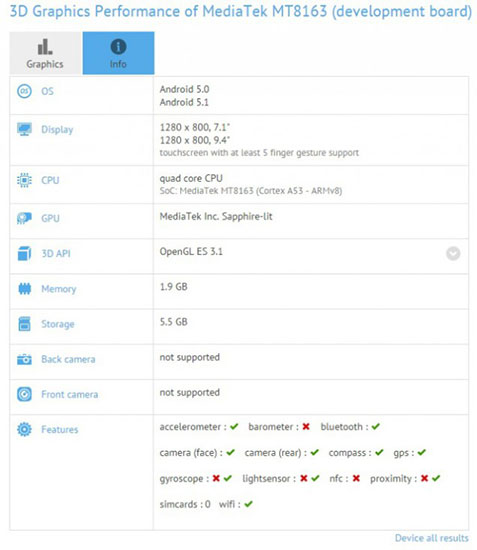 به هر حال، بخش ویژهی MT8163 پردازندهی چهارهستهای آن نیست؛ مهمتر از آن پردازندهی گرافیکی موبایلی است که در SoC جای گرفته. بر اساس تصاویر، پردازندهی گرافیکی به نام MediaTek Inc. Sapphire-lit معرفی شده و درحالی که نامی از AMD برده نشده، اما نباید فراموش کنیم که Sapphire یکی از فروشندههای زیرمجموعهی شرکت سازندهی پردازندهی گرافیکیِ AMD است. به هر حال، باید ببینیم که چرا در گزارش بنچمارک نام Sapphire و نه AMD ذکر شدهاست؟ آیا ممکن است Sapphire به کلی یک شرکت متفاوت از آنچه ما میشناسیم باشد؟ این سوالات تنها احتمالاتی هستند که برای مشخص شدن درستی یا عدم صحت آنها باید تا انتشار جزئیات بیشتر از بنچمارکها یا عرضهی رسمیِ MT8163 منتظر باشیم.