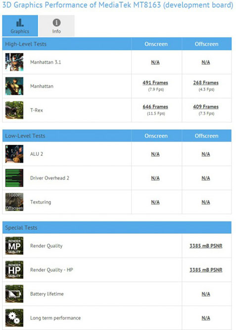 با توجه به امتیازاتی که MT8163 بدست آورده، به نظر میرسد که این چیپست طبیعت سرگردانی دارد. در Manhattan 3.1، امتیاز بدست آمده توسط پردازنده گرافیکی آن را برابر با پردازندهی گرافیکی Mali T760 قرار میدهد (T760 هنوز تایید نشده زیرا تعداد هستههای آن در سمت راست نام مدل پردازنده گرافیکی ذکر نشده). به هر حال در تست T-Rex، MT8163 امتیاز بسیار پایینی آورده که باعث میشود به این نتیجه برسیم که این پردازنده احتمالا آن چیزی که فکر میکردیم نیست!