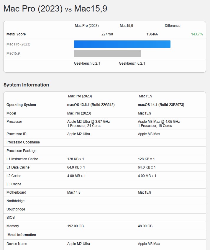 با این وجود، نمرات و امتیاز Metal (که میزان قدرت تراشههای سری A و سری M اپل را در سناریوهای سختگیرانه بررسی میکند)، نشان میدهد که سیلیکون مکبوک پرو نمیتواند با M2 Ultra رقابت کند.