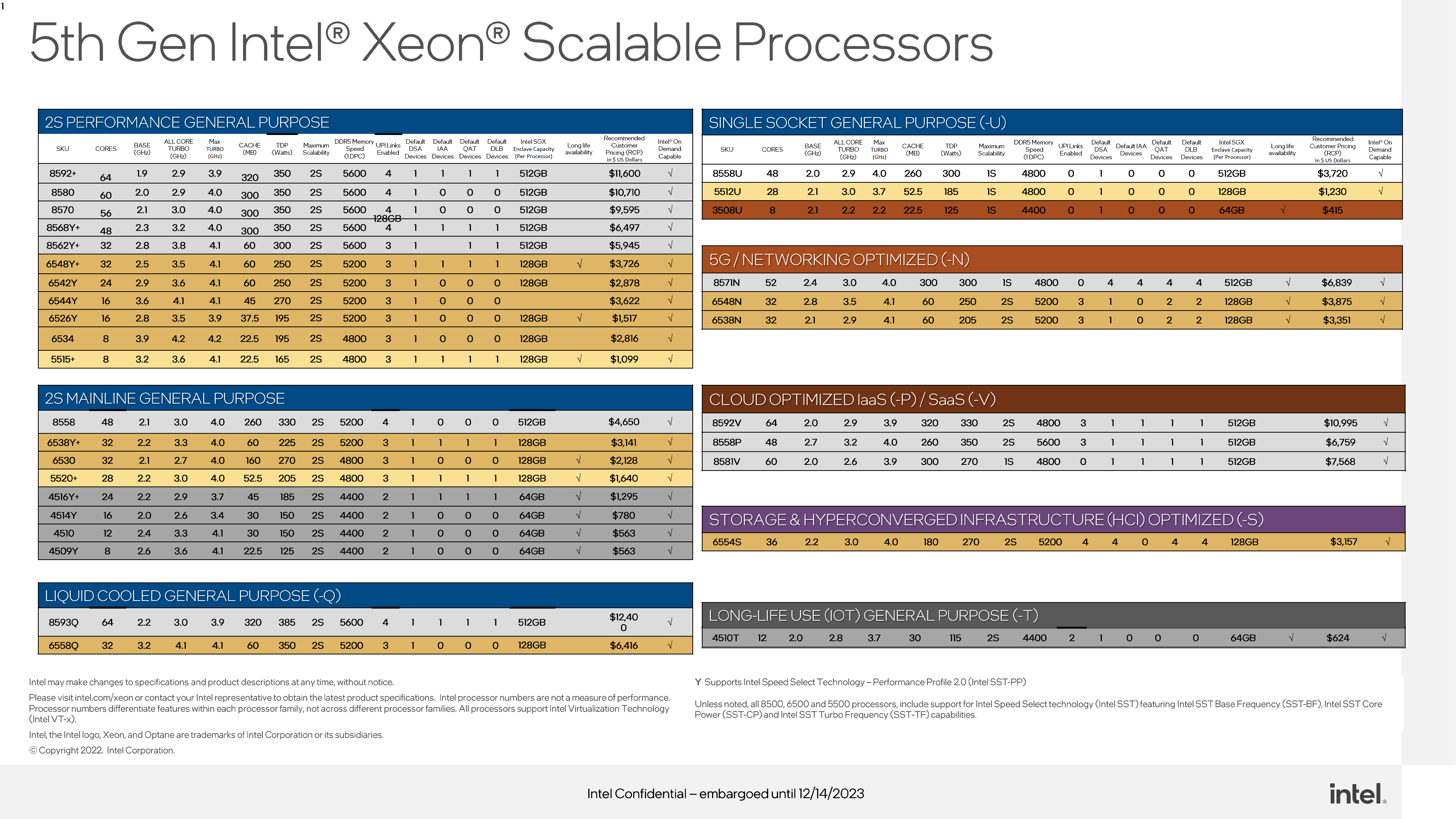 قرار است این پردازنده در سه نسخه روانه بازار شود. نسخه مشخص شده با عنوان «+» برای استفادههای عمومی مناسب است. نسخه مشخص شده با حرف Q برای سیستمهای مجهز به خنک کننده مایع طراحی شده است. نسخه نشان داده شده با حرف V هم برای استفاده در سیستمهای ابری بهنیهسازی شده است. پردازنده Xeon Platinum 8592 دارای 64 هسته پردازشی، 128 رشته پردازشی، 320 مگابایت حافظه کش L3، سرعت Boost در حدود 3.90 گیگاهرتز و همچنین 385، 350 و 330 وات انرژی مصرفی برای هرکدام از این سه نسخه است. قیمت این پردازنده نیز 11000 تا 12000 دلار اعلام شده است.