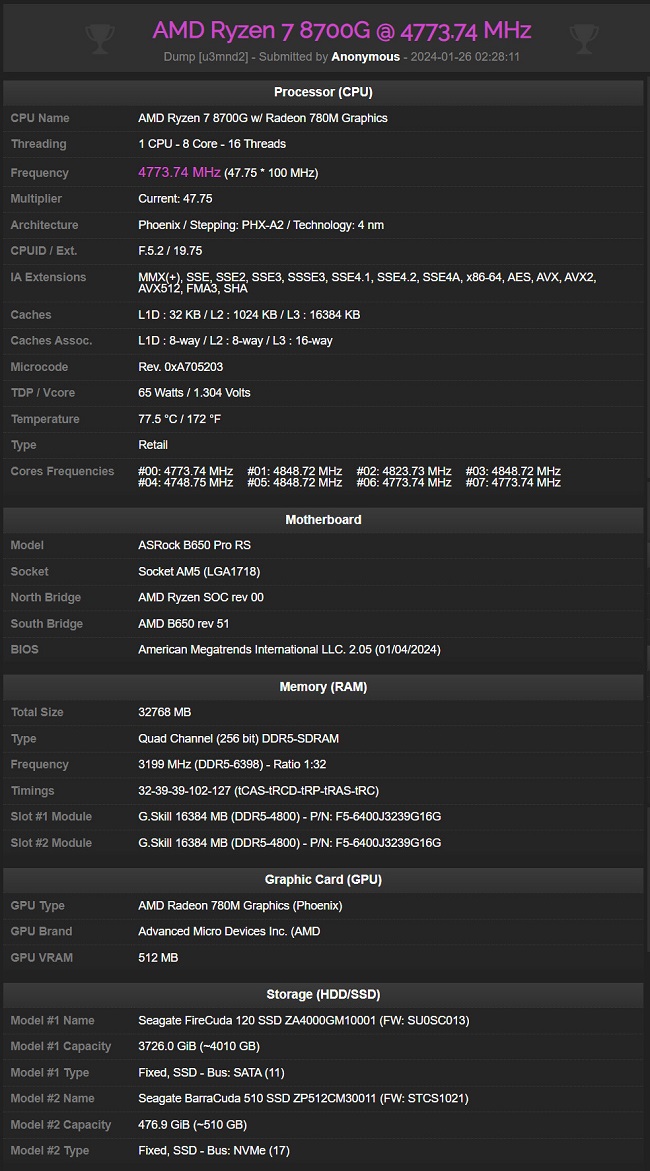 به گزارش Techpowerup، سیستم تست APU جدید Ryzen 7 8700G از مادربرد B650 Pro RS ازراک و 32 گیگابایت حافظه رم پرسرعت DDR5-6400 (تایمینگ نسبتاً محدود 102-39-39-32) تشکیل شده است. در کنار این سختافزارها خبری از کارت گرافیک مجزا نبوده و تستر از همان پردازنده گرافیکی مجتمع Radeon 780M و سیستمعامل ویندوز 11 و حافظه اساسدی 500 گیگابایتی Seagate BarraCuda 510 استفاده کرده است.