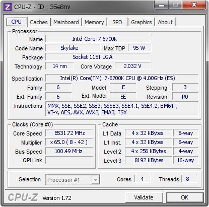 یک اورکلاکر لهستانی موفق شده که فرکانس Core i7-6700K را از 4000 مگاهرتز پایه به مقدار خارق العاده 6531 مگاهرتز؛ آنهم بدون نیاز به غیرفعال سازی فناوری Hyper-Threading برساند. برای دست یابی به این رکورد خیره کننده ولتاژ پردازنده به 2.032 ولت افزایش داده شده و از نیتروژن مایع برای خنک کردن تراشه در حال سوختن استفاده شده است. این اورکلاکر مادربرد MSI Gaming Z170 را با یک ماژول حافظه DDR4 بخدمت گرفته بود. طی فرایند اورکلاکینگ؛ فرکانس ماژول حافظه 4287 مگاهرتز بوده که خود میزان بالایی برای ماژول های DDR4 است.
