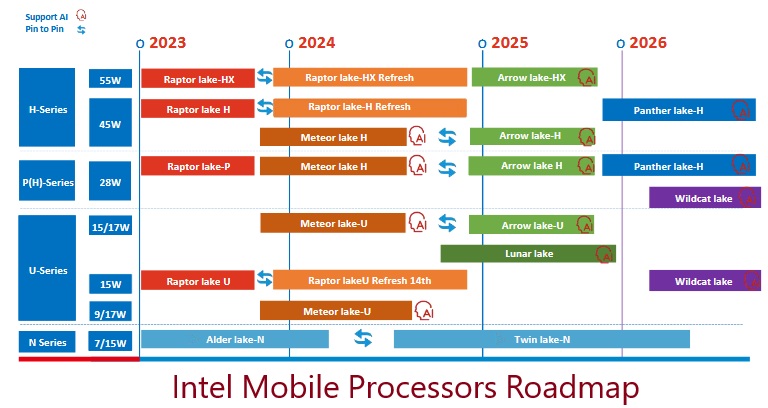 همچنین برای خانواده موبایل نیز نمایندههای اینتل Panther Lake-H در سریهای P و H خواهند بود که در توانهای 28 و 45 وات راهی لپتاپها خواهند شد. البته در نقشه راه مذکور اسامی از پردازندههای کممصرتر و بهینهتر Wildcat Lake در دو ویرایش 28 و 15 وات آمده که احتمالاً با پسوندهای P و U وارد بازار خواهند شد.