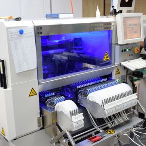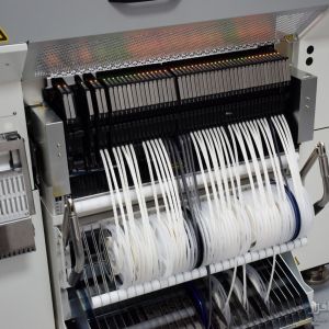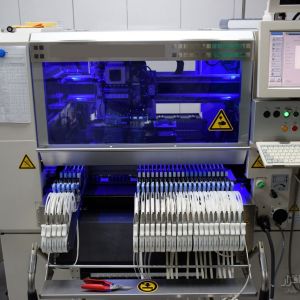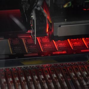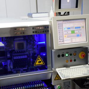 دستگاه بعدی که در خط تولید با آن روبرو میشویم، دستگاه مونتاژ قطعات با فناوری نصب سطحی یا همان دستگاه مونتاژ SMT است که قطعات الکترونیکی مانند تراشهها، خازن، مقاومت و دیگر مدارهای مجتمع را با برداشتن از مخزنی که برای آنها در نظر گرفته شده، روی برد قرار داده و عمل مونتاژ را انجام میدهد. در این دستگاه با توجه به اندازه کوچک قطعات مورد استفاده و حوزه کاری تولید رم و SSDهای فرکانس بالا در ابعاد کوچک، دقت بسیار بالایی نیاز است. به همین خاطر FDK از تجهیزات بسیار دقیق و حرفهای استفاده میکند تا بتوان از عملکرد بینقص بخش اولیه مونتاژ مطمئن بود.
