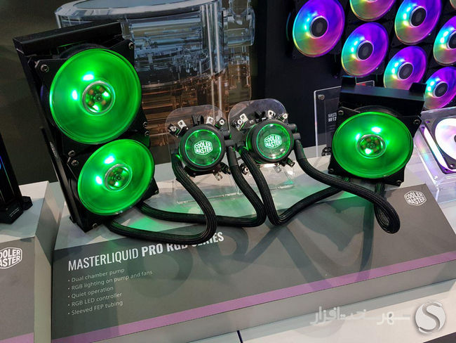 کولرهای آبی سری Masterliquid Pro RGB این کمپانی از پمپهای دوحفرهای برای دستیابی به شدت جریان بهتر روی قطعه هدف بهره میبرند. نورپردازی RGB روی فنها و پمپ، عملکرد بیصدای فنها، کنترلر RGB LED و همچنین تیوبهای FEB که محل اتصال لولهها با دیگر اجزا را پوشاندهاند، از ویژگیهای این محصولات ردهبالای کولر مستر هستند. شما میتوانید تصاویر این محصولات را در زیر مشاهده کنید