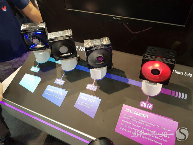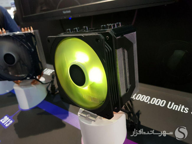 اما در این میان این کمپانی دو نمونه کولر بادی هم به نمایش گذاشته بود که یکی کولر بادی بسیار جالب Wraith Ripper و یکی هم کولر H212 مدل ۲۰۱۸ بود. شما میتوانید جزییات کامل مدل اول را در مطلب مرتبط با آن مطالعه کنید. اما کولر مستر در H212، سیاست استفاده از پروانههای آلومینیوم را افزایش داده و به نسبت مدل سال قبل با ۴ لولهی انتقال حرارت، در این مدل از ۵ لوله برای انتقال حرارت استفاده کرده است. همچنین طراحی این محصول به گونهای است که هیچ مزاحمتی برای حافظههای رم بوجود نمیآید و میتوان آن را با تمامی مدلهای رم استفاده کرد. نورپردازی RGB قابلشخصیسازی روی فن و لوگوی محصول از دیگر ویژگیهای این محصول است.