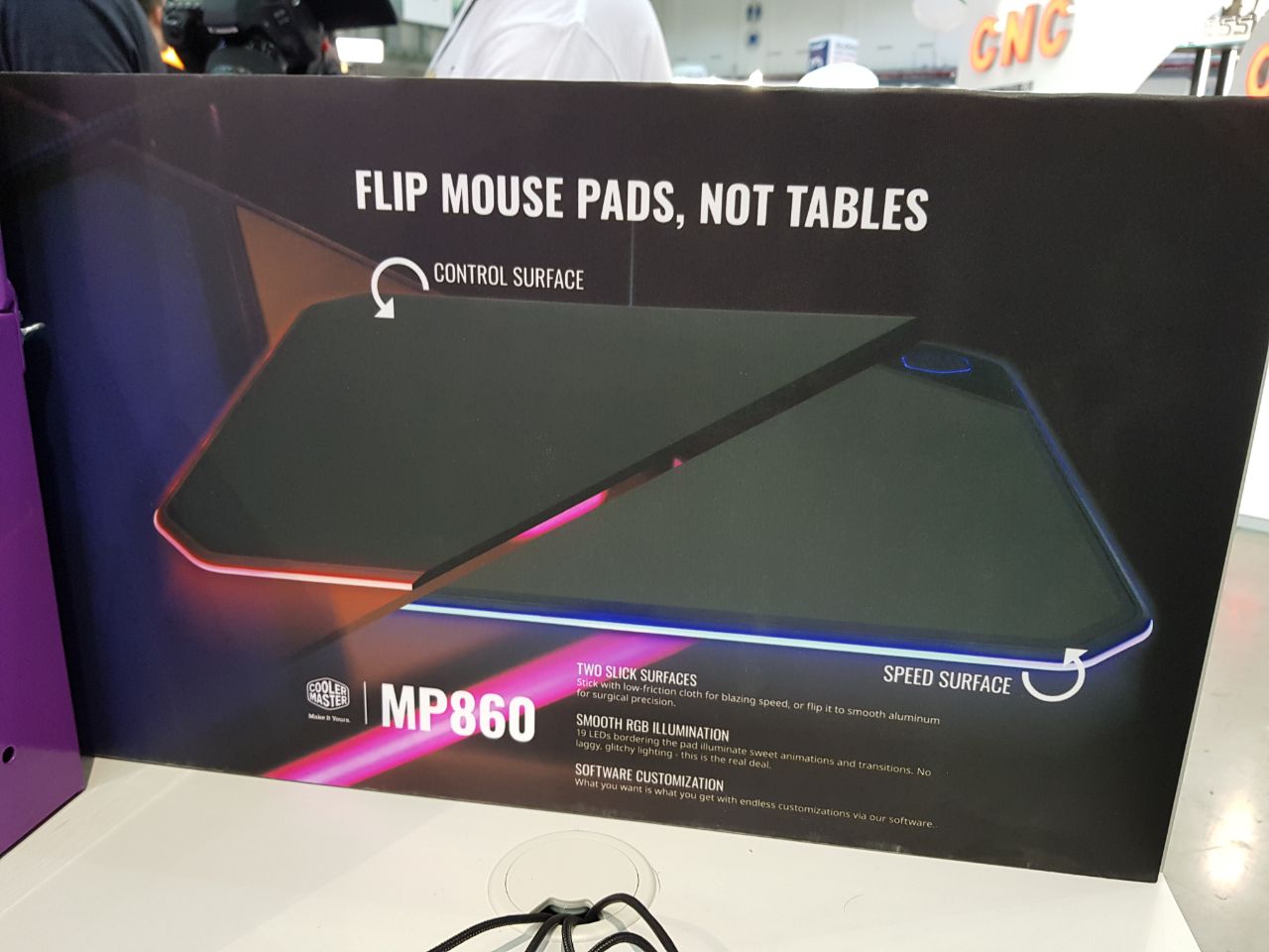 همچنین در کنار این سه موس، یک پد نیز توسط کولرمستر به نمایش درآمد که البته قبلتر در نمایشگاه CES 2018 معرفی گردیده بود. این پد با نام MP860 مجهز به نورپردازی RGB در کنارههای خود است. ویژگی جالب این پد استفاده از دو متریال مختلف در تولید هر سطح آن است. یک سمت این پد از جنس پارچه با اصطکاک پایین برای مواقعی که کاربر به سرعت بیشتر نیاز دارد بوده و سمت دیگر آن از جنس آلومنیوم برای افزایش دقت است.