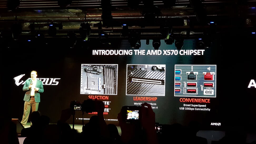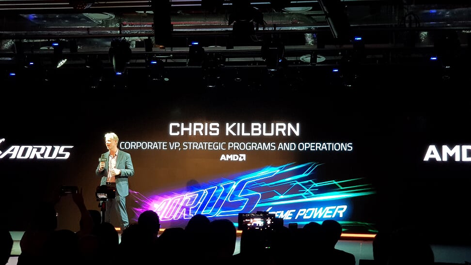 در بخش دیگری از مراسم آقای Chris Kilburn از مدیران ارشد شرکت AMD به روی صحنه آمد و درباره همکاری با گیگابایت، برنامههای راهبردی ایامدی و عملکرد این شرکت در حوزه پردازندهها سخن گفت. در قسمت بعدی برنامه، آقای Travis Kirsch (از دیگر مدیران ارشد AMD) به سخنرانی پرداختند. ایشان نیز به معرفی چیپست X570 و قابلیتهای آن پرداختند. همچنین عملکرد پردازندههای نسل سوم رایزن را تشریح کردند.