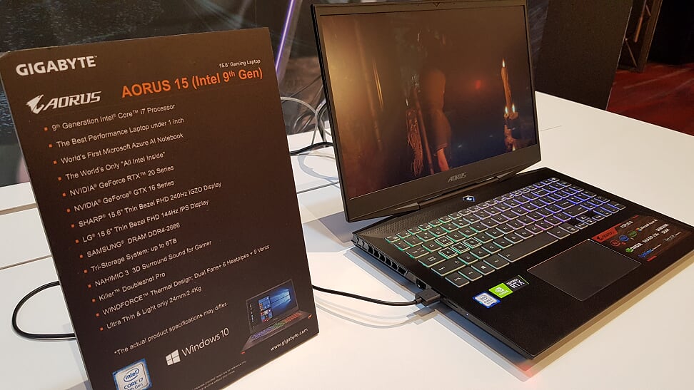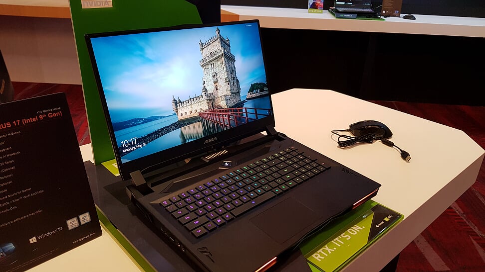 بخش دیگری از این نمایشگاه خصوصی گیگابایت، به لپتاپهای این شرکت اختصاص داشت. لپتاپهای Aero 15 و Aero 17 از جمله این محصولات بودند. لپتاپ Aero 15 این بار با با داشتن پردازنده نسل نهم Core i9 اینتل ظاهر شده بود. این لپتاپ از کارت گرافیک سری NVIDIA RTX 20 بهره میّبرد. اما نکتهی جالب درباره این محصول، نمایشگر آن است. نمایشگر این لپتاپ از نوع OLED (ساخت سامسونگ) و با وضوح 4K است که ترکیبی بینظیر را ارائه میدهد.
