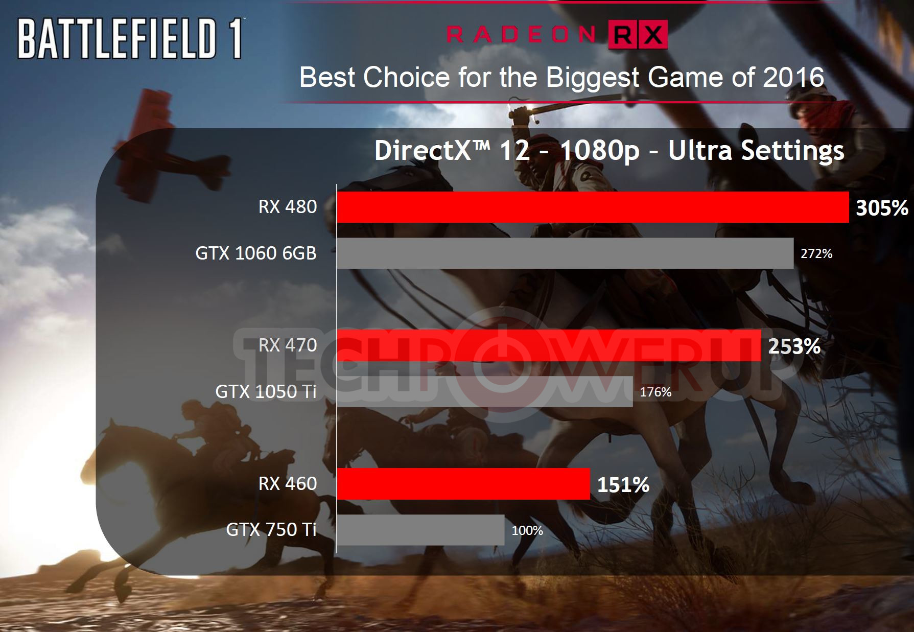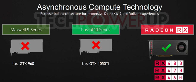در این اسلایدها، AMD به پشتیبانی نکردن معماری Pascal انویدیا از محاسبات ناهمگن (asynchronous compute) اشاره کرده است، قابلیتی که توسط برخی بازی ها پشتیبانی می شود. AMD همچنین ادعا می کند پردازنده های گرافیکی RX 480 ،RX 470 و RX 460 به ترتیب از GTX 1060 ،GTX 1050 Ti و GTX 750 Ti در اجرای بازی Battlefield 1 در حالت رندر با DirectX 12 عملکرد بهتری دارند. در نهایت AMD به مقایسه کارایی محصولات خود با رقیب پرداخته است.