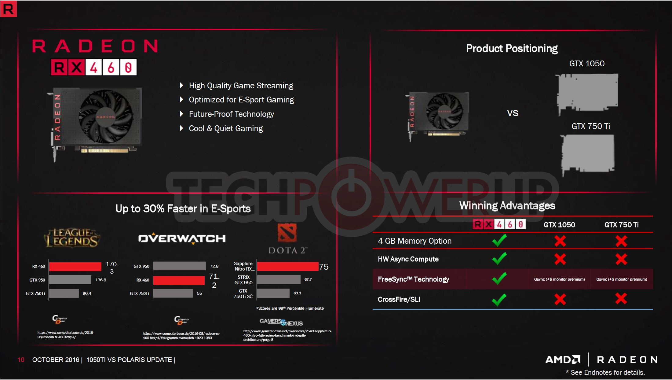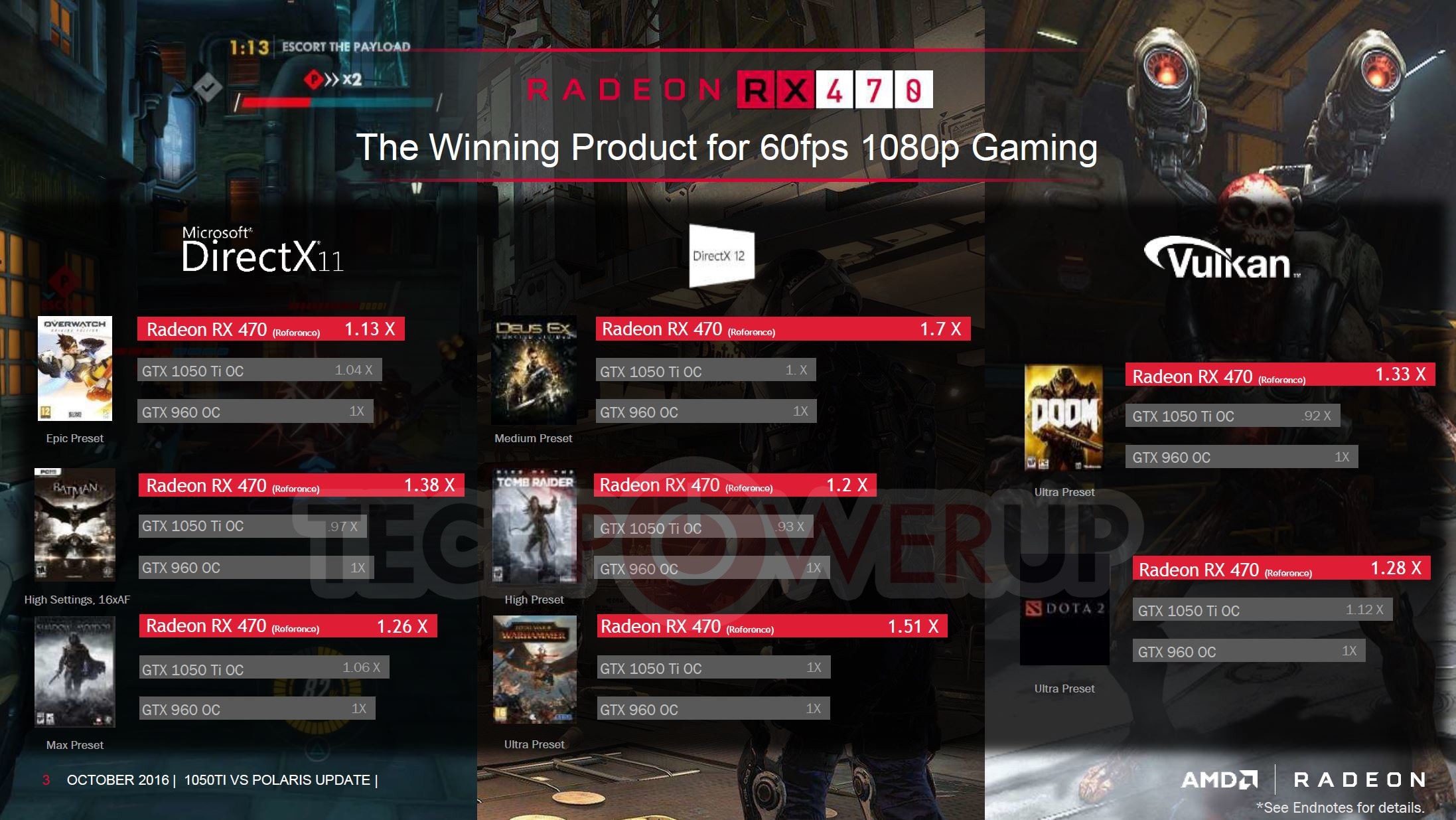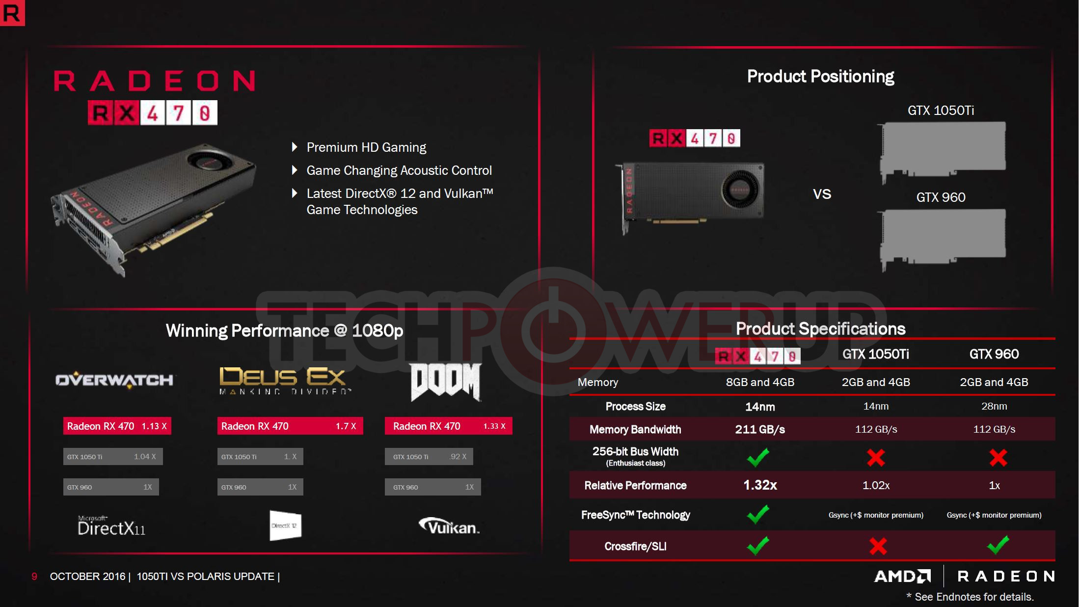 هم زمان با کاهش قیمت کارت های گرافیک RX 470 و RX 460، اسلایدهایی از AMD منتشر شده که دلایل ترجیح دادن RX 470 به GTX 1050 Ti انویدیا را شرح می دهد. هرچند RX 470 حدود 30 دلار از GTX 1050 Ti گرانتر است، اما دست کم به گفته AMD ارزش صرف هزینه بیشتر را دارد.