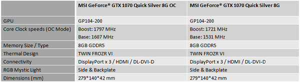 کمپانی MSI به مناسبتی نامشخص، دو کارت گرافیک جدید در تعداد محدود تحت سری Quick Silver عرضه می کند. GeForce GTX 1070 Quick Silver 8G در دو مدل معمولی و نسخه اورکلاک شده برای علاقمندان عرضه می شود. این کارت ها بر پایه برد PCB با طراحی تمام کاستوم و مجهز به کولر پرآوازه TWIN FROZR VI در رنگبندی منحصر بفرد هستند.