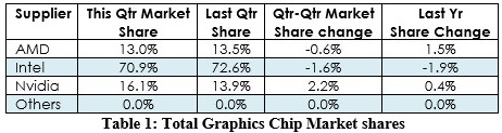 حجم توزیع تراشه های AMD مجهز به پردازنده گرافیکی مجتمع (نظیر APUها) در مقایسه با فصل گذشته 10 درصد کاهش یافته اما در بخش کامپیوترهای قابل حمل 19.1 درصد رشد را نشان می دهد. توزیع پردازنده های گرافیکی مجزا دسکتاپ نیز 23.0 درصد و در مجموع حجم توزیع پردازنده های گرافیکی AMDا15.4 درصد در مقایسه با فصل قبل افزایش یافته است.