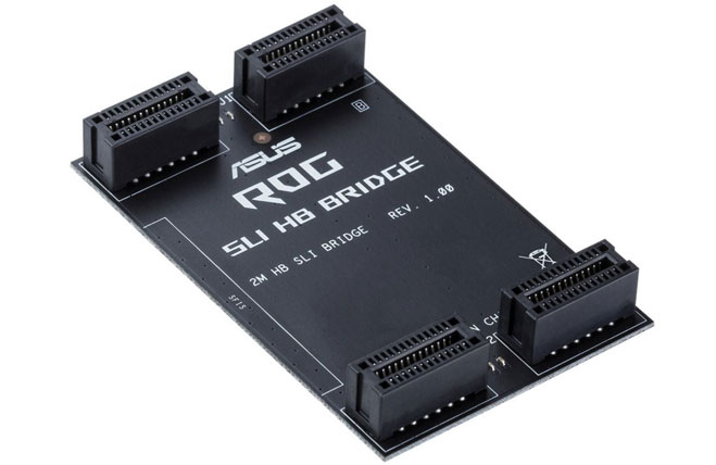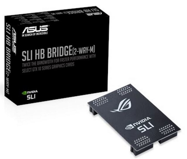 SLI HB ایسوس از یک برد فایبرگلاس و کانکتورها تشکیل شده، همان کارکرد گونه های لوکس را ارائه می کند اما برای تهیه آن تنها به پرداخت کسری از قیمت بریج های لوکس نیاز است. این بریج برای SLI کردن دو کارت (یک اسلات خالی بین دو کارت) طراحی شده است.