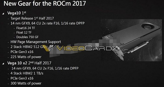 هم زمان ظاهراً یک اسلاید افشا شده اطلاعاتی از اولین تراشه مبتنی بر ریزمعماری Vega ارائه می کند، از آنجایی که این اسلاید دستکاری شده به نظر می رسد، خیلی نمی توان به آن اعتماد کرد، با این حال به نظر می رسد تراشه Vega 10 دارای 4096 پردازنده جریانی در قالب 64 واحد CU و همچنین حافظه HBM2 باشد. توان حرارتی 225 وات نیز قابل توجه است.
