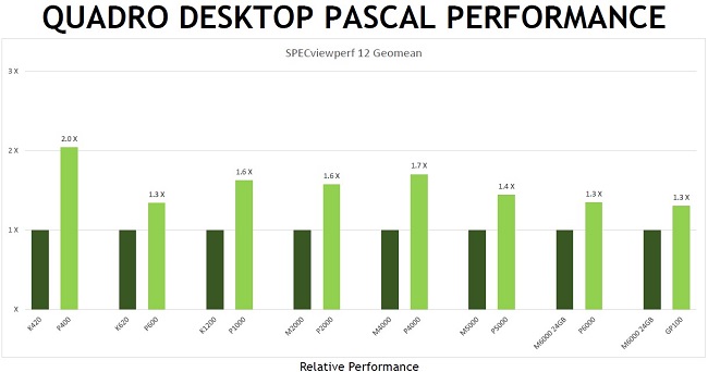 تصویر فوق جایگاه کارت های ورک استیشن سری Quadro P انویدیا را بر اساس کارایی نشان می دهد، همانطور که مشاهده می کنید درست همانند کارت های دسکتاپ، Pascal در زمینه کارایی محض و بهره وری در صدر جدول قرار گرفته است. تصویر زیر کارایی نسبی را نشان می دهد: