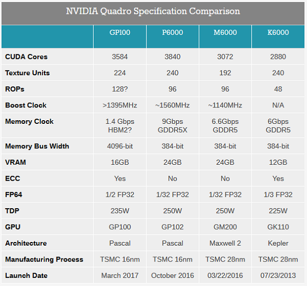 GP100به عنوان پرچمدار جدید Quadro معرفی شده، این کارت به 16 گیگابایت حافظه HBM2 مجهز است و می بایست به آسانی کارت Quadro P6000 را پشت سر بگذارد. همچنین می توان آسانی Quadro GP100 را از طریق NVLink به کارت دوم متصل کرد، این فناوری از ارتباط نقطه-به-نقطه بین پردازنده گرافیکی و یا بین پیکربندی گرافیکی با پردازنده با پهنای باند 80 گیگابایت بر ثانیه بهره می گیرد.