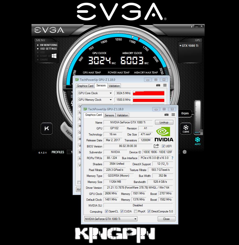 EVGA و اورکلاکر نزدیک به این کمپانی، K|ngp|n، هر دو در صفحه فیسبوک خود تصویری را منتشر کرده اند که کارت گرافیک EVGA GTX 1080 Ti را در فرکانس خارق العاده 3,024 مگاهرتز با فرکانس موثر حافظه 12,000 مگاهرتز نشان می دهد. این اولین بار در دنیا است که فرکانس هسته پردازنده گرافیکی دست کم GTX 1080 Ti از مرز 3000 مگاهرتز عبور می کند.