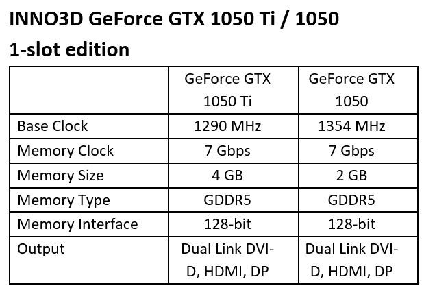 Inno3D GTX 1050 Ti (1-Slot Edition) دارای فرکانس پایه هسته 1290 مگاهرتز و فرکانس بوست هسته 1392 مگاهرتز است. مدل GTX 1050 دارای فرکانس پایه هسته 1354 مگاهرتز است اما فرکانس بوست آن مشخص نیست.