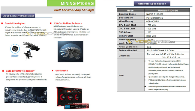 ایسوس دست کم یک کارت به نام MINING-P106-100-6G برای ماینرها دارد. پیش از هر چیز این مدل گذاری کارت های مخصوص ماینینگ است که جلب توجه می کند، احتمالاً شما هم متوجه نبود پسوند GTX در این کارت شده اید. کارت های ماینینگ به خروجی تصویر نیاز ندارند و به همین دلیل هم فاقد خروجی تصویر هستند.