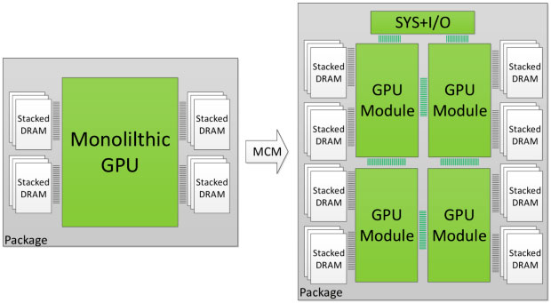 انویدیا به تازگی مقالهای منتشر کرده که نشان میدهد این کمپانی قادر است اجزای مختلف را درون یک پردازنده گرافیکی به یکدیگر پیوند بدهد و تراشه بزرگ تری بسازد. طبق این پژوهش، این طراحی امکان ساخت پردازندههای گرافیکی بزرگتر با توان پردازشی بالاتر را ممکن میکند. طبق همین مقاله، طراحی مورد بحث نه تنها به چیره شدن بر مشکلات رایج کمک میکند، بلکه از آنجایی که تولید چندتراشه کوچکتر از یک تراشه یک تکه بزرگتر ارزانتر تمام میشود، به کاهش هزینه ساخت نیز کمک میکند. در طراحی مزبور میتوان تراشههای کوچکتر را به یکدیگر وصل کرد و یک تراشه بزرگتر و قویتر ساخت.