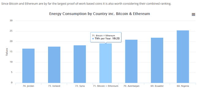 طبق برآوردهای Digiconomist که دنیای ارزهای رمزنگاری شده را دنبال میکند، استخراج بیت کوین سالانه 15.54 ترا وات ساعت و ایتریوم 4.69 ترا وات ساعت انرژی مصرف میکند که روی هم رفته 19.23 ترا وات ساعت در سال انرژی مصرف میکنند. Digiconomist انرژی مصرفی این دو ارز محبوب را روی هم گذاشته که به کسب نتیجه بسیار جالب انجامیده است، انرژی الکتریکی که ماینرهای دنیا صرف استخراج بیت کوین و ایتریوم میکنند، بیشتر از کل مصرف کشورهایی چون اردن، ایسلند و سوریه است.