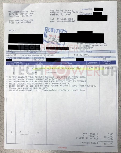 طبق تصویری که از فاکتور خرید متعلق به یک فروشگاه خرده فروشی در آمریکا منتشر شده، این تنها فروشندگان نیستند که از کمبود موجودی کارت های Radeon RX Vega سود هنگفتی به جیب میزنند، بلکه توزیع کنندگان نیز قیمت ها را بالا برده اند. تصویر فوق فاکتور فروش یک توزیع کننده انبوه به نام Ma Laboratories Inc را نشان می دهد که مدل مرجع Radeon RX Vega 64 را با قیمت 675 دلار، درست 176 دلار بیشتر از قیمت فروش رسمی عرضه می کند. بدون شک باید قیمت فروش توزیع کننده به خرده فروش بسیار کمتر از قیمت 499 دلار مصرف کننده باشد که چنین نیست. اگر توزیع کنندگان به دلخواه خود بتوانند قیمت ها را افزایش دهند، باید منتظر قیمت های از این هم بالاتر بود. هم اکنون در برخی مناطق کارت های Radeon RX Vega با قیمت تا چهار برابر قیمت رسمی فروخته می شوند.