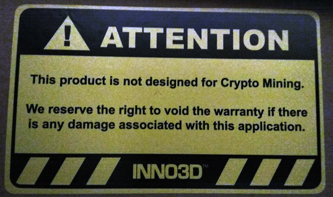 Inno3D اولین سازنده ای است که با درج یک برچسب بر روی کارت های خود، هشدار داده این کمپانی این حق را برای خود محفوظ می داند که خرابی های ناشی از ماینینگ باعث ابطال وارانتی شود. هرچند در ظاهر این موضوع صرفاً یک اقدام احتیاطی به نظر می رسد، اما شنیده ها از دل صنعت کارت گرافیک حاکی از رشد شدید میزان مرجوعی کارت ها به سازندگان است و همین مسئله آنها را به این فکر وا داشته تا خرابی های ناشی از ماینینگ را از دایره تعهدات خود خارج کنند.