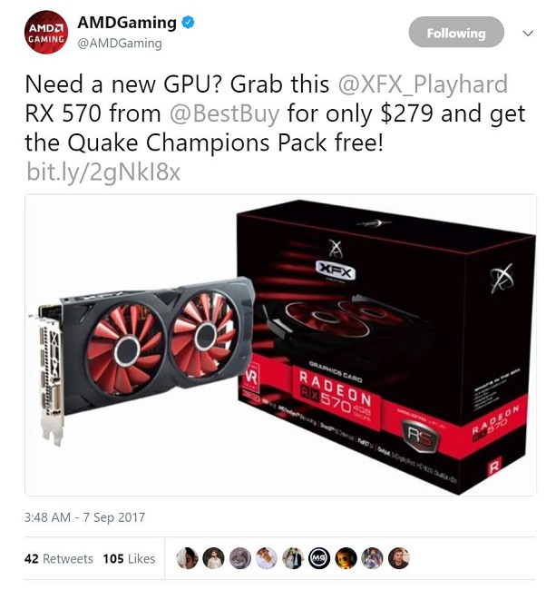 یک اکانت رسمی متعلق به AMD در شبکه تویتر با شناسه "AMDGaming" که معمولاً به معرفی محصولات گیمینگ این کمپانی میپردازد، اخیراً در یک پست به گیمرهای ناراضی از وضع موجود، خرید کارت گرافیک 4 گیگابایتی XFX Radeon RX 570 به همراه کپن بازی Quake Champions را با قیمت 279 دلار پیشنهاد کرده که عملاً سهیم شدن این کمپانی در گرانیها است و خشم کاربران را بر انگیخته. کارت یاد شده در اصل با قیمت 179 دلار عرضه شد که توصیه به خرید آن با قیمت 279 دلار عملاً توهین به خریدارن جویای کارت گرافیک جدید محسوب می شود.