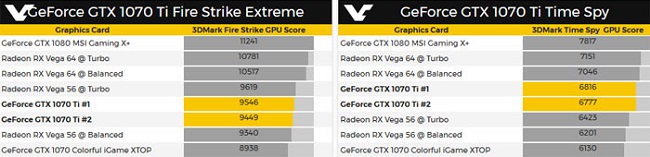 اگرچه هنوز بنچمارکهای رسمی از میزان عملکرد کارت گرافیک GTX 1070 Ti در دسترس قرار نگرفته است اما سایت VideoCardz چندی پیش دو نتیجه از بنچمارکهای 3DMark را منتشر کرد که نشان میدهد این کارت گرافیک دقیقاً با هدف رقابت با کارت گرافیک Radeon RX Vega 56 طراحی و تولید شده است.