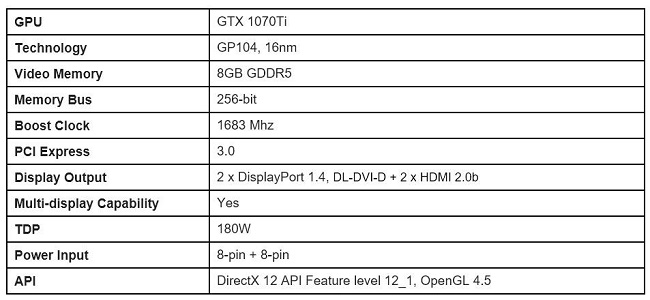 طبق اطلاعات منتشر شده از سوی کمپانی سازنده، کارت گرافیک GTX1070Ti Vulcan X با هدف استفاده توسط کاربران حرفهای و کسانی که به دنبال دریافت بهترین عملکرد هستند طراحی شده و به این منظور یک سیستم خنک کننده کارآمد را در خود جای داده است. همچون دیگر محصولات مبتنی بر کارت GTX1070Ti، این کارت گرافیک نیز سرعت پایه 1607 مگاهرتز و سرعت Boost در حدود 1683 مگاهرتز را داراست و هشت گیگابایت حافظه GDDR5 را از طریق یک رابط 256 بیت در اختیار کاربران قرار میدهد.