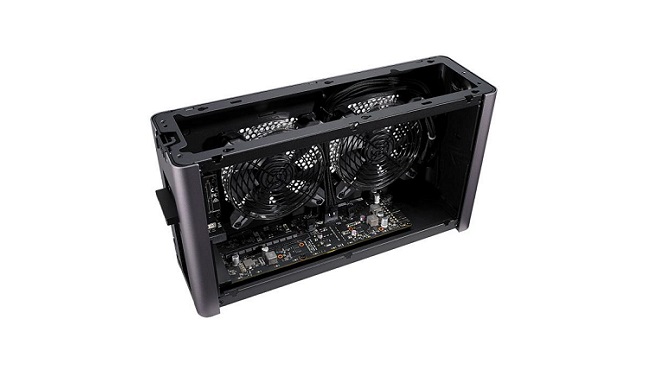 XG Station Pro دارای یک پورت Thunderbolt 3 است که امکان انتقال اطلاعات تحت پهنای باند 40 گیگابیت بر ثانیه را فراهم میکند. این کیس تمام آلومینیومی همچنین قادر است با یک منبع تغذیه قدرتمند و با فراهم کردن 330 وات توان، کارتهای گرافیک خارجی را پشتیبانی نماید. این کیس همچنین در ابعادی کوچک و جمع جور طراحی شده است تا فضای کمی را بر روی میز کار کاربران اشغال کند.