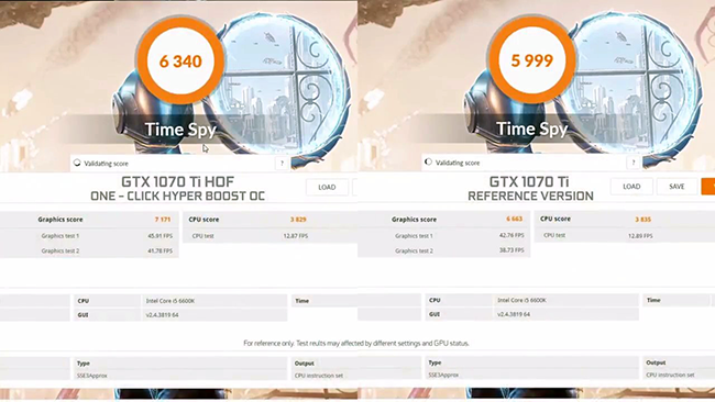 درست همانند کارتهای GTX 1070 Ti دیگر برندها، این کارت نیاز دارای همان فرکانسهای مرجع انویدیا است، با این حال به کمک برنامه مکمل اختصاصی GALAX به نام Xtreme Tuner Plus تنها با یک کلیک میتوان آن را اورکلاک کرد. شات زیر تأثیر سویچ به حالت Hyper Boost OC را نشان میدهد که به وضوح با افزایش کارایی همراه است.